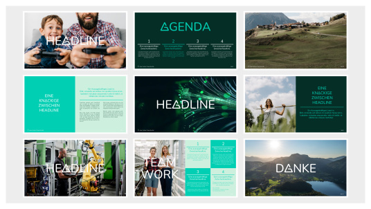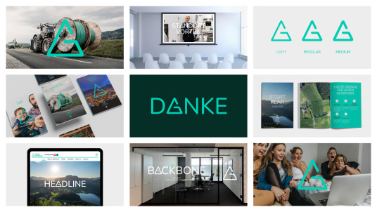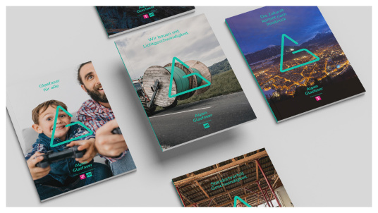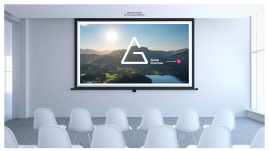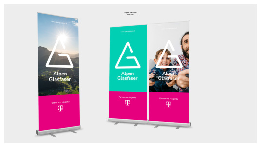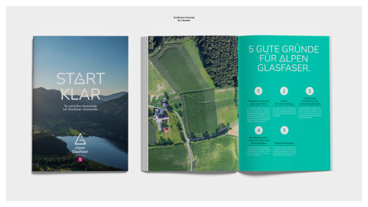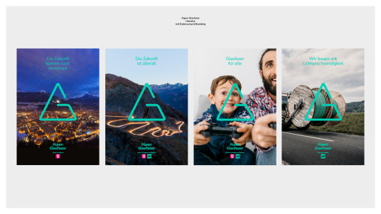 Der vorgegebene Name „Alpen Glasfaser“ war doch ziemlich sperrig – unser Ehrgeiz, ein unkompliziertes Logo zu gestalten, umso größer. Wir haben einfach einen Berg als „A“ für die Alpen sowie ein Kabel als „G“ für die Glasfaser kombiniert – das Ganze stilistisch in der Formensprache des Mutterkonzerns Meridiam. Und diesen neugeborenen Buchstaben haben wir unkompliziert in die Hausschrift und die Kommunikatonsidee integriert.